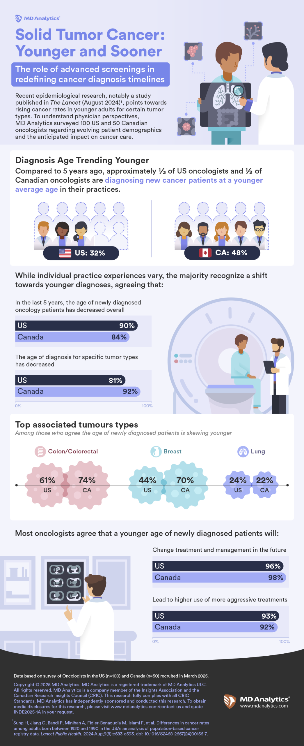 This change in age demographics could have meaningful implications for treatment strategies. Nearly all oncologists surveyed—98% in Canada and 96% in the U.S.—believe that a decline in the average age of diagnosis will alter how treatment and patient management are approached in the future. In addition, the majority expect that this shift will result in an increased use of more aggressive treatment options, with 92% of Canadian and 93% of U.S. oncologists anticipating a greater demand for such therapies.