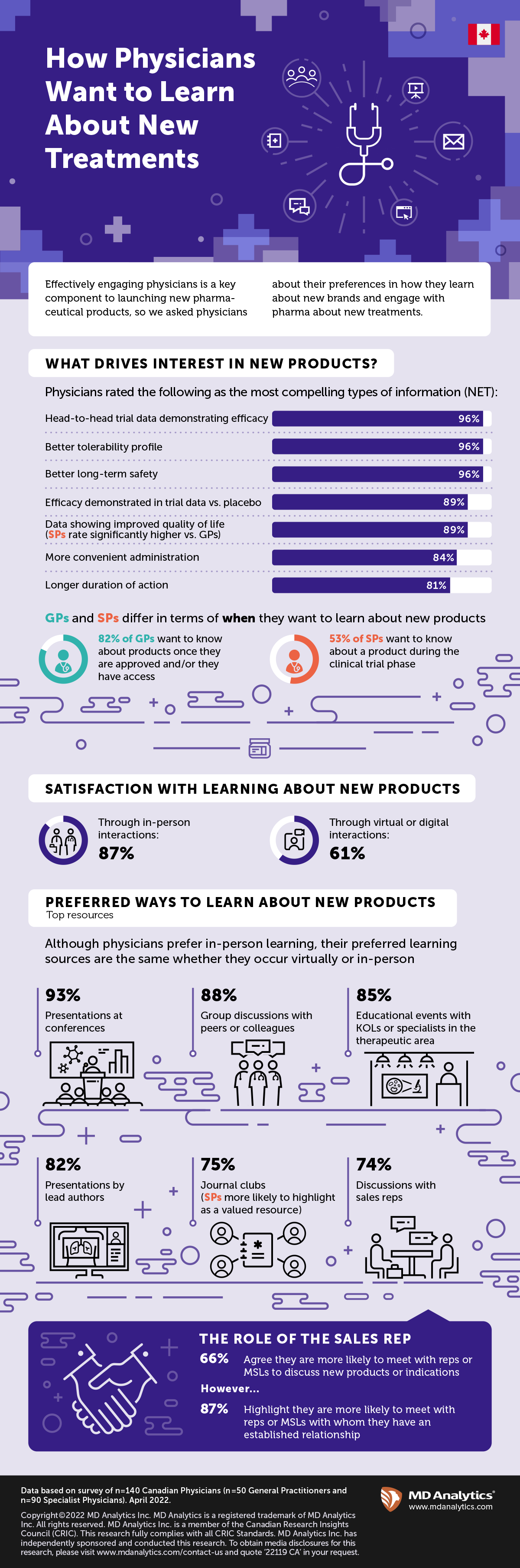 Overall, physicians express greater satisfaction when learning about new products through in person interactions compared to virtual or digital interactions. However, regardless of how they learn about new product, the types of resources physicians prefer are similar. The top most preferred resources for both GPs and Specialists include presentation at conferences, discussions with peers, educational events that include KOLs or treatment areas experts, presentations by lead authors, journal clubs and discussions with Pharmaceutical reps. While a majority agree (66%) they are more likely to engage with reps or MSLs to discuss new products or indications, more physicians agree (87%) they are more likely to meet with a rep or MSL with whom they have an established relationship.