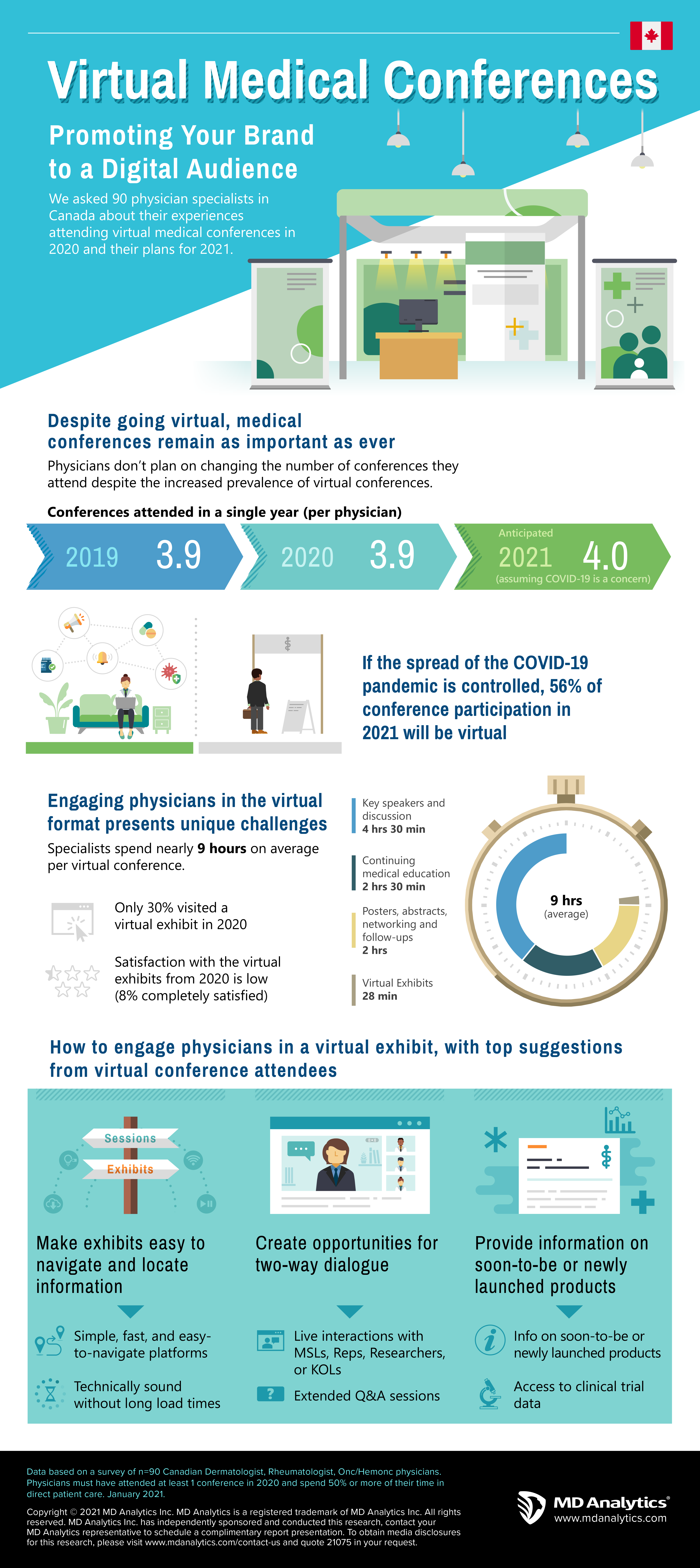 As a result of the pandemic over the past year, conference organizers and medical brands were set scrambling to find a solution to limit cancelations of key medical conferences. Resulting virtual platforms advanced quickly to emulate the face-to-face conference experience through a digital means. Many virtual medical conferences were successful, in terms of strong participation levels to many key events both national and international. However, questions remained as to how well they met the needs of physicians, other healthcare providers and the pharmaceutical and medical device companies sponsoring these events. Furthermore, many exhibitors and conference organizers alike wondered if attendees would continue to embrace the virtual conference format once the impact of the pandemic subsided.