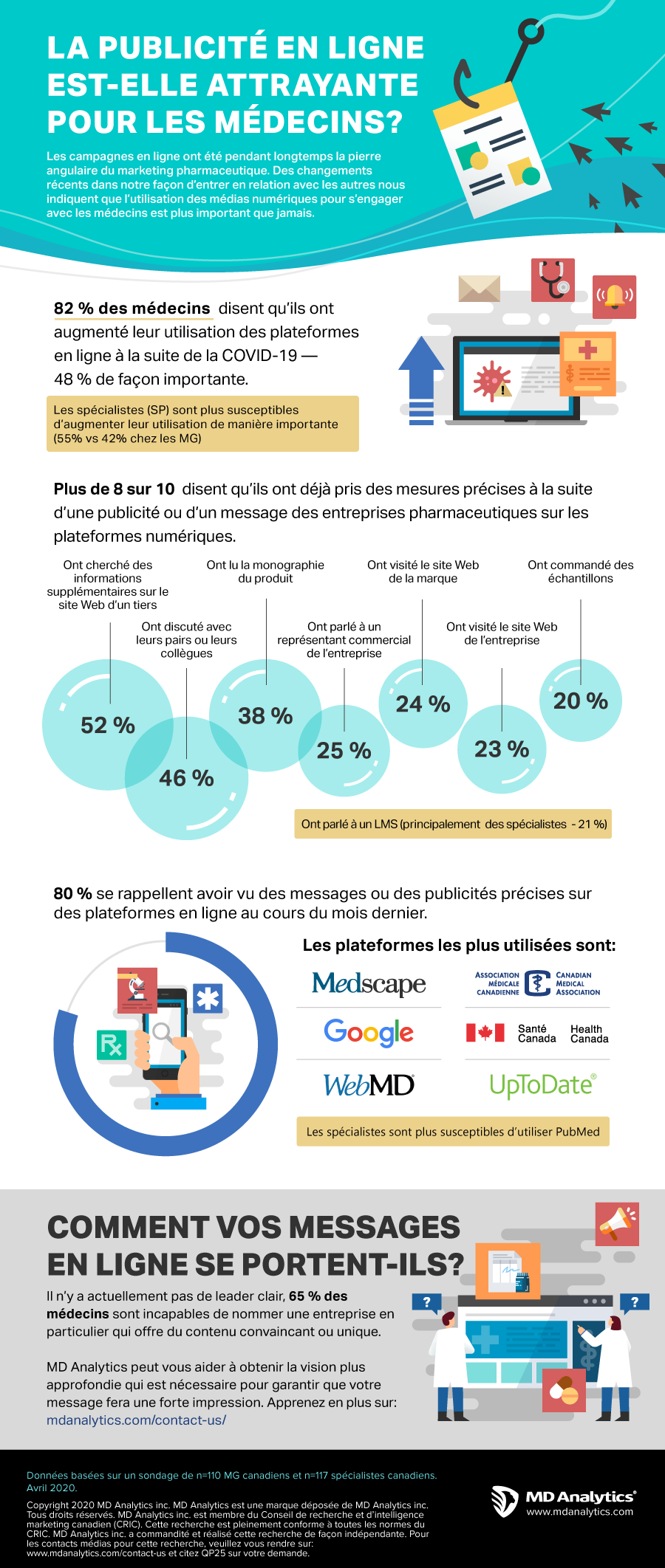 Une publicité et des messages en ligne forts sont essentiels pour maximiser l’impact de toute campagne de marketing. En raison des récentes restrictions sur les interactions en personne, la publicité et les messages en ligne jouent un rôle encore plus important dans la communication avec les médecins. Les résultats d’un sondage réalisé auprès de n=227 médecins canadiens montrent que 82 % des médecins canadiens ont augmenté leur utilisation des plateformes en ligne en raison de la COVID-19, dont 48 % de manière considérable.