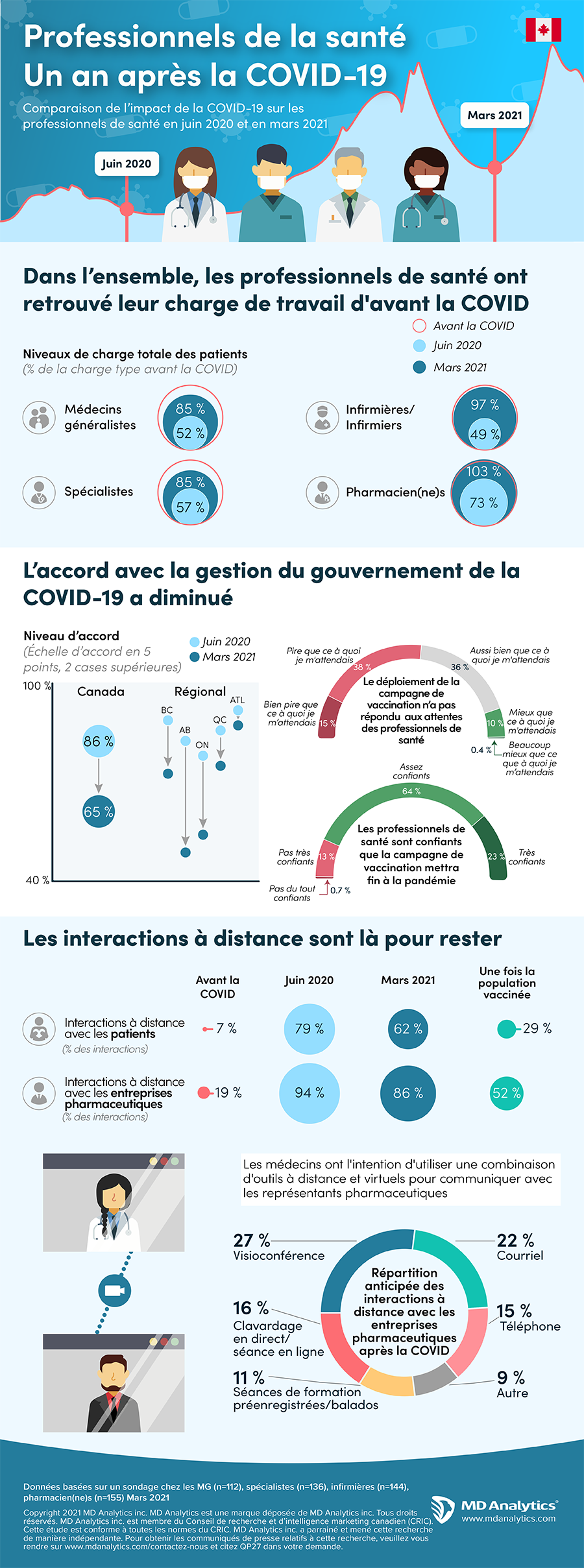 Notre dernière courte étude menée auprès des professionnel(le)s de la santé présente l’état actuel des pratiques des HCP au Canada et leur évaluation de la gestion de la COVID-19 par le gouvernement depuis le début de la pandémie. Les données sont basées sur les réponses de 112 médecins généralistes, 136 spécialistes, 144 infirmières et 155 pharmacien(ne)s. Cette étude se penche également sur les changements intervenus dans les types d’interaction avec les patients et l’industrie pharmaceutique. Poursuivez votre lecture et consultez notre infographie pour en apprendre davantage sur la façon dont les professionnel(le)s de la santé ont été touché(e)s et sur les changements qui sont appelés à rester.