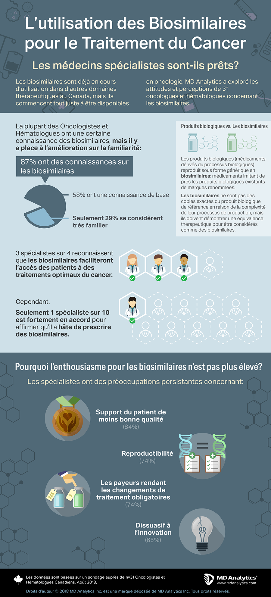 Depuis les années 1990, les médicaments biologiques qui sont des produits à base de protéines dérivés de cellules vivantes utilisant la biotechnologie, sont utilisés comme option de traitement pour les patients vivant avec le cancer. Depuis 2009, des thérapies biosimilaires (produits biologiques équivalents sur le plan thérapeutique) sont disponibles dans différents domaines thérapeutiques au Canada et ils sont sur le point de devenir disponibles pour une utilisation en oncologie. MD Analytics a demandé à 31 oncologistes et hématologues canadiens de donner leur point de vue sur l’introduction de thérapies biosimilaires pour le traitement du cancer.
