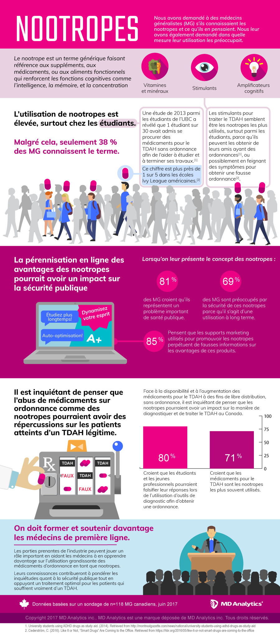 Lors de leur introduction au concept de substances nootropiques, 85 % des médecins généralistes croyaient que le matériel utilisé en marketing pour promouvoir les substances nootropiques transmettent de fausses informations sur les avantages de ces produits; 81 % estiment qu’il s’agit d’un problème de santé publique important; 69 % sont préoccupés par la sécurité en ce qui concerne l’utilisation à long terme de substances nootropiques. Consultez notre infographie pour un aperçu plus détaillé des résultats de cette étude.
