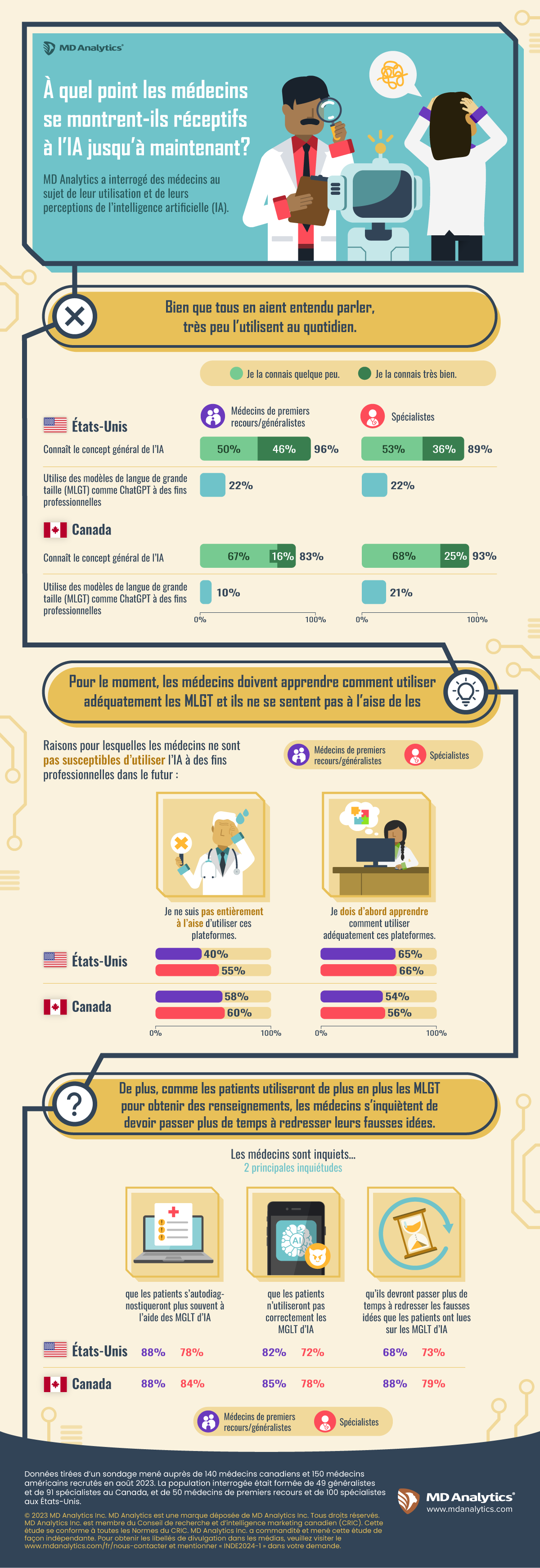 MD Analytics a récemment mené une étude auprès de 300 médecins afin d’explorer leur degré de connaissance en matière d’IA, leur utilisation des outils qui en découlent et leurs préoccupations à son sujet ainsi que de déceler les occasions à saisir dans le secteur. Les résultats montrent que, bien que l’IA ait fait des progrès en soins de santé, les médecins ne semblent pas très versés dans l’usage de ces outils. Selon les données de notre sondage, moins de la moitié d’entre eux disent bien connaître le concept général de l’IA.