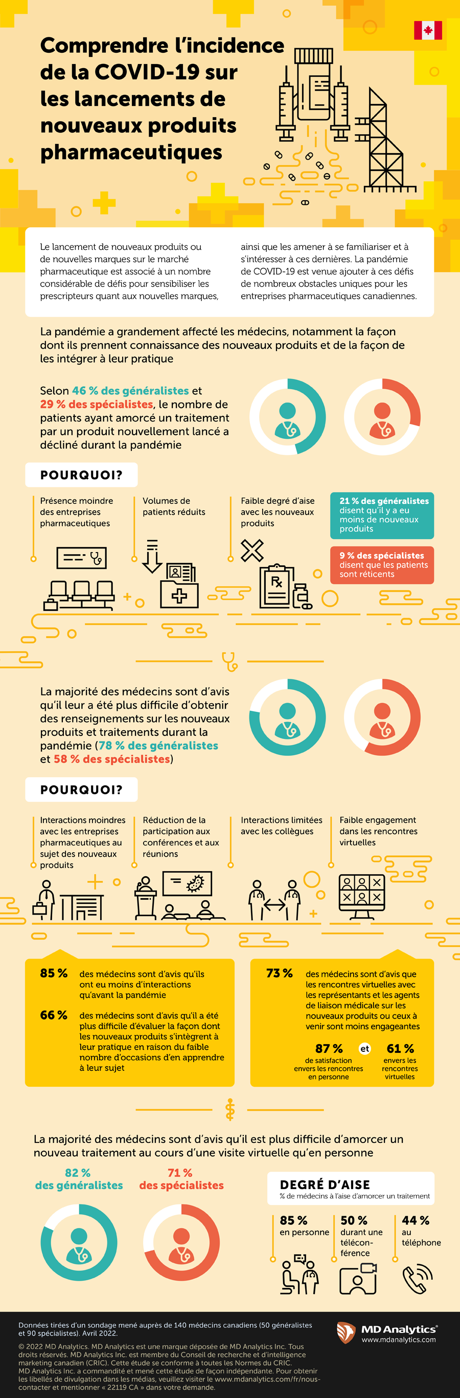 La pandémie de COVID-19 a eu une incidence importante sur les activités des médecins, notamment la façon dont ils prennent connaissance des nouveaux produits et de la façon de les intégrer à leur pratique. Près de 1 spécialiste sur 3 et presque la moitié des généralistes ont indiqué que leur utilisation de nouveaux produits a baissé durant la pandémie, principalement en raison d’une moindre présence des entreprises pharmaceutiques, d’une réduction générale du volume de consultations de patients et d’un manque d’aise à prescrire de nouveaux médicaments.
