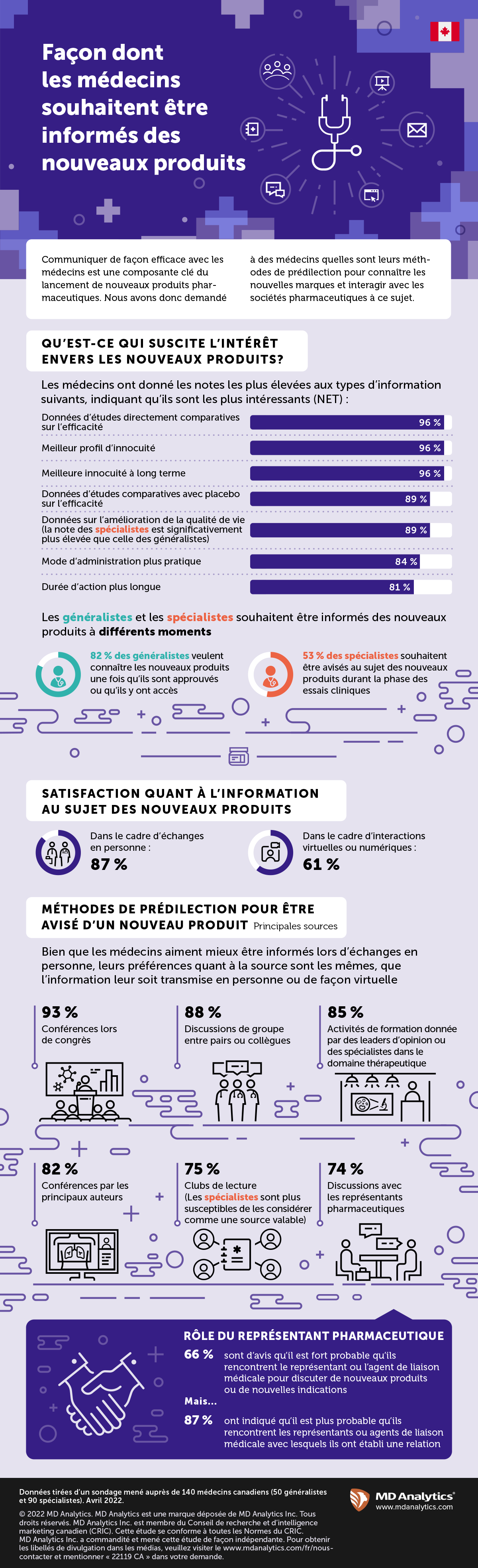 Dans l’ensemble, les médecins expriment une plus grande satisfaction lorsqu’ils prennent connaissance de nouveaux produits dans le cadre d’interactions en personne que lorsque ces renseignements leur sont transmis de façon virtuelle ou numérique. La source de ces derniers que les médecins préfèrent est toutefois comparable, peu importe quelle méthode est utilisée pour la transmission des renseignements. En effet, les sources de prédilection tant des généralistes que des spécialistes comprennent les exposés lors de conférences, les discussions entre pairs, les activités de formation données par des leaders d’opinion ou des experts dans le domaine thérapeutique, les exposés par les auteurs principaux d’une publication, les clubs de lecture et les discussions avec les représentants pharmaceutiques. Bien que la majorité des médecins (66 %) s’entendent pour dire qu’il est fort probable qu’ils s’entretiennent avec un représentant ou un agent de liaison médicale au sujet de nouveaux produits ou de nouvelles indications, une plus grande proportion d’entre eux (87 %) affirment qu’ils sont plus susceptibles de rencontrer un représentant ou un agent de liaison médicale avec qui ils ont déjà établi une relation.