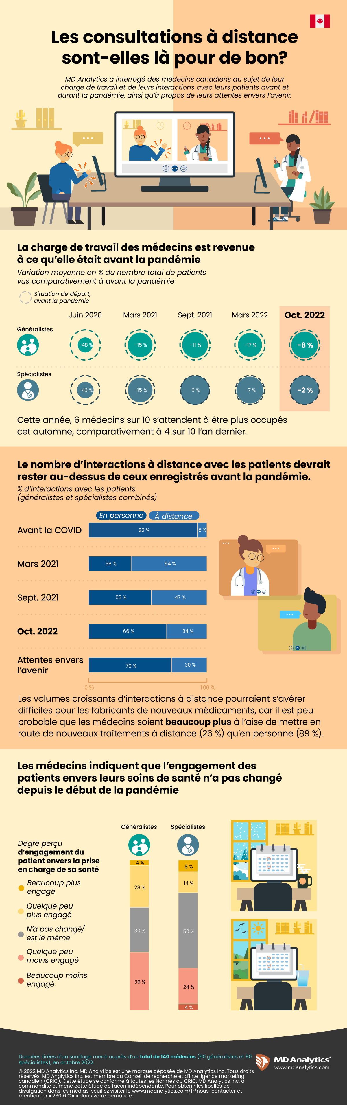 Les résultats montrent que si la charge de travail des médecins est presque revenue aux niveaux d’avant la pandémie, il n’en va pas de même de la façon dont les médecins interagissent avec les patients. Bien que cela ne soit pas aussi important qu’au début de la pandémie, une plus grande proportion des consultations des patients se fait maintenant à distance, comparativement à avant la pandémie. Les médecins ne s’attendent pas à ce que cela change beaucoup dans les mois à venir et, même si cela ne tenait qu’à eux, ils souhaiteraient conserver une part importante de leurs interactions avec les patients dans des environnements à distance.