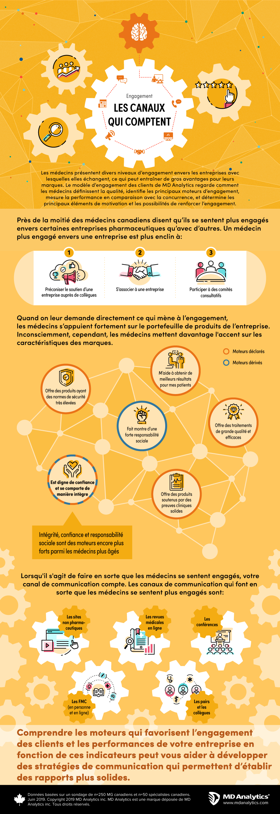 En utilisant notre modèle d’engagement des clients pour l’industrie pharmaceutique, nous avons cherché à mieux comprendre comment les médecins canadiens (généralistes et spécialistes) définissent l’engagement des clients et, par la même occasion, ce que les entreprises peuvent faire pour communiquer avec eux et les faire participer de manière plus constructive.